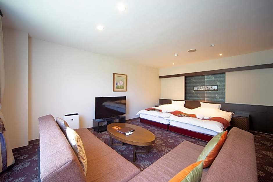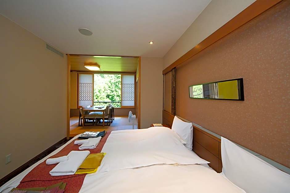The spacious air-conditioned twin room offers a flat-screen TV, tatami, a seating area, a wardrobe as well as mountain views. The unit has 2 beds.